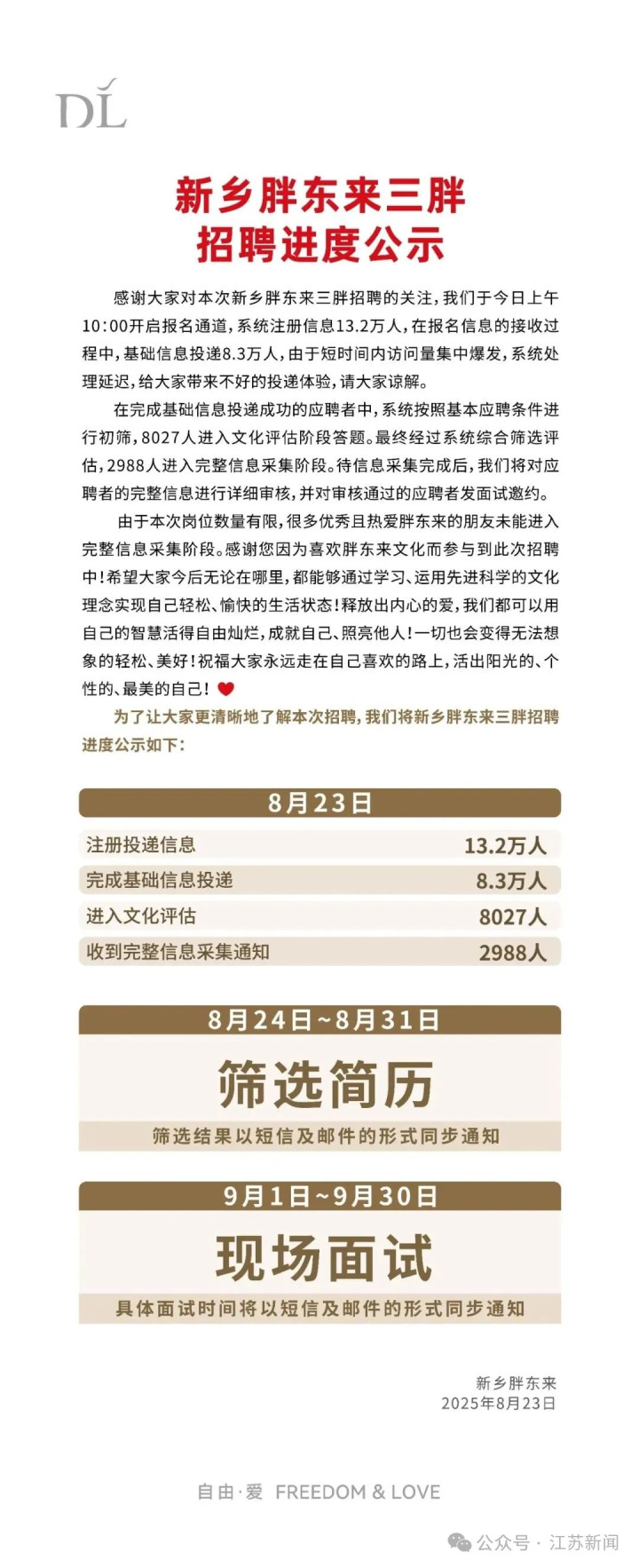 其表示,招聘报名系统数据显示,系统注册信息13.2万人,其中8.3万人成功完成基础信息投递。在完成基础信息投递的人员中,经过系统对基本应聘条件的初步筛选,共有8027人进入文化评估阶段答题。最终,2988人成功进入完整信息采集阶段。胖东来表示,在完成信息采集后,将对这些应聘者的完整信息进行详细审核,并向审核通过者发送面试邀约。